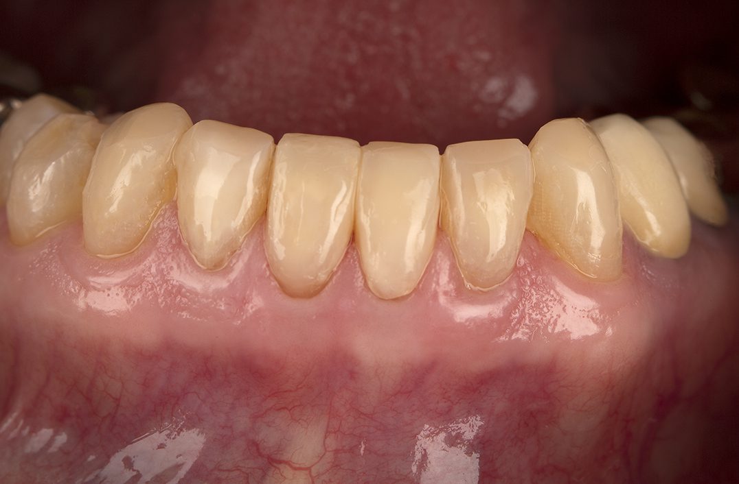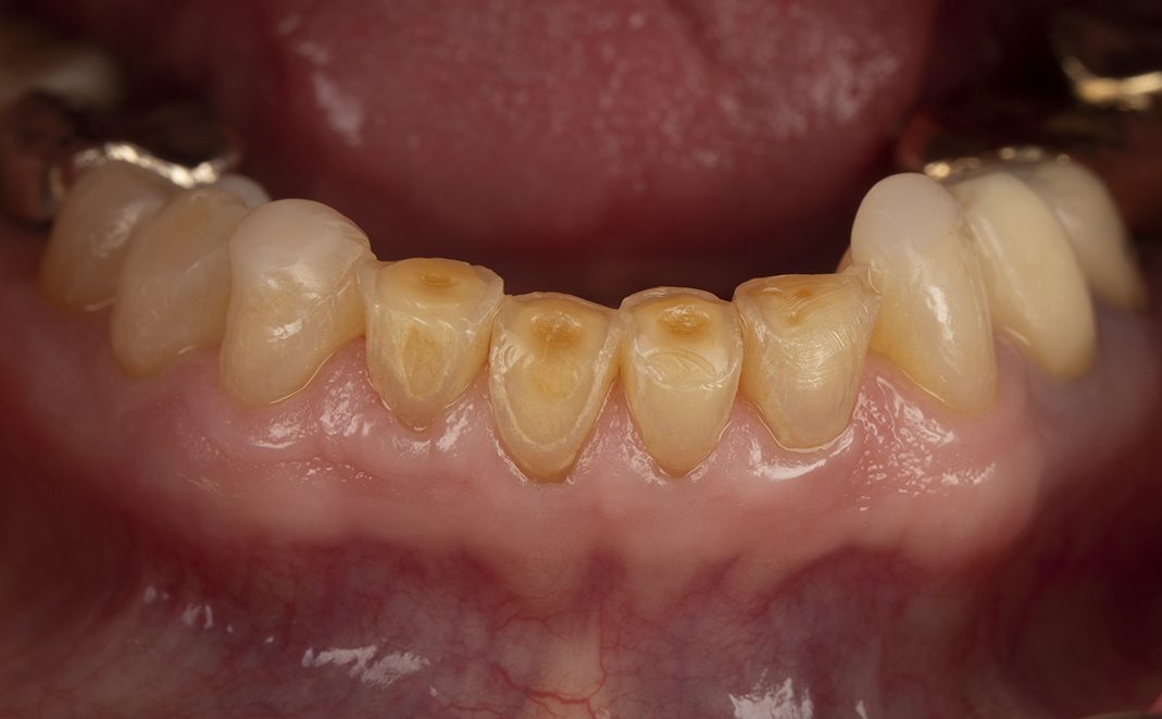 An 85-year-old patient presented with incisal wear and discoloration of the mandibular anterior teeth. The orthodontist had proceeded with a unidisciplinary treatment and referred the patient to our restorative team for occlusal and esthetic evaluation after the patient indicated their concerns. There was inadequate occlusal dimension, and it was decided to intrude the mandibular anterior teeth and alter and improve the occlusal scheme using a minimally invasive preparation and the injection resin technique prior to the completion of orthodontics. A diagnostic wax-up was used to guide the restorative plan, and an EXACLEAR™ (a clear VPS material) matrix was fabricated to accurately transfer the new anatomical contours. Restorations were carried out tooth by tooth, ensuring optimal function and esthetics with a conservative approach suited for a geriatric patient.