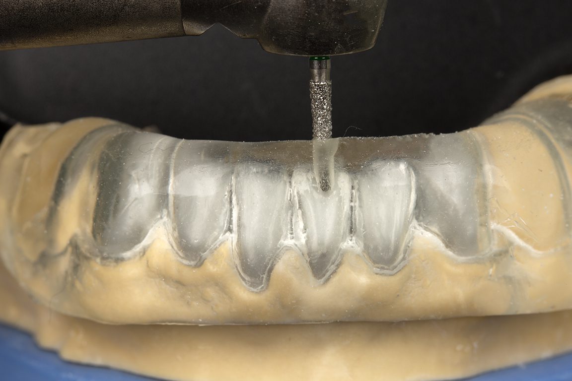 An EXACLEAR™ matrix fabricated to replicate the wax-up on the mandibular arch. Access holes above teeth to be restored made using a tapered diamond bur.