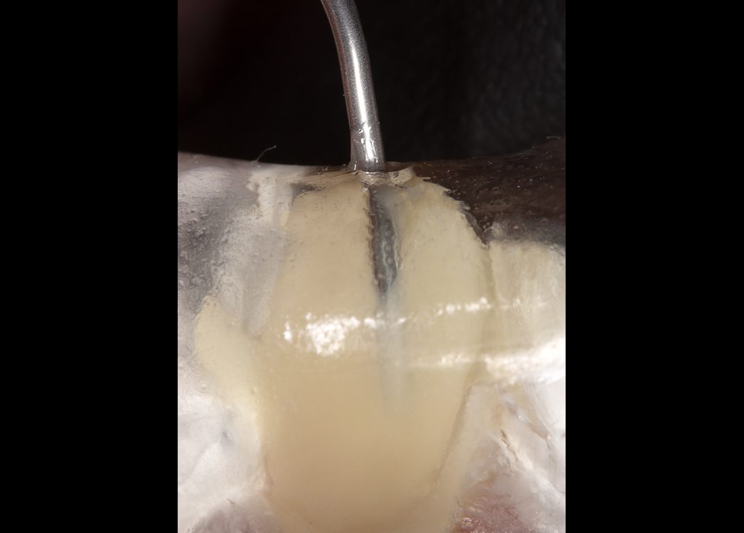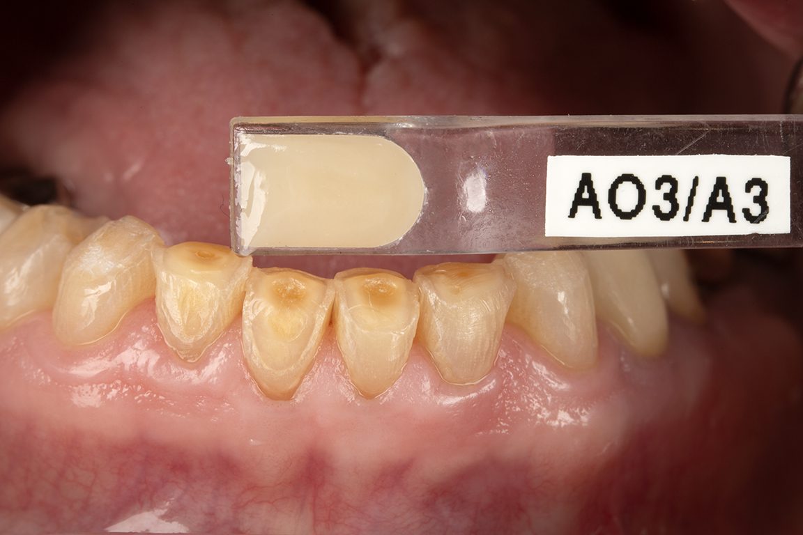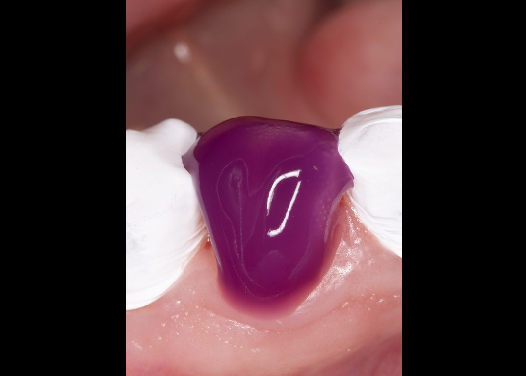 The EXACLEAR™ matrix was placed over the anterior segment of the mandibular arch, and G-ænial™ Universal Injectable - Shade AO3 was injected followed by Shade A3, then light-cured.