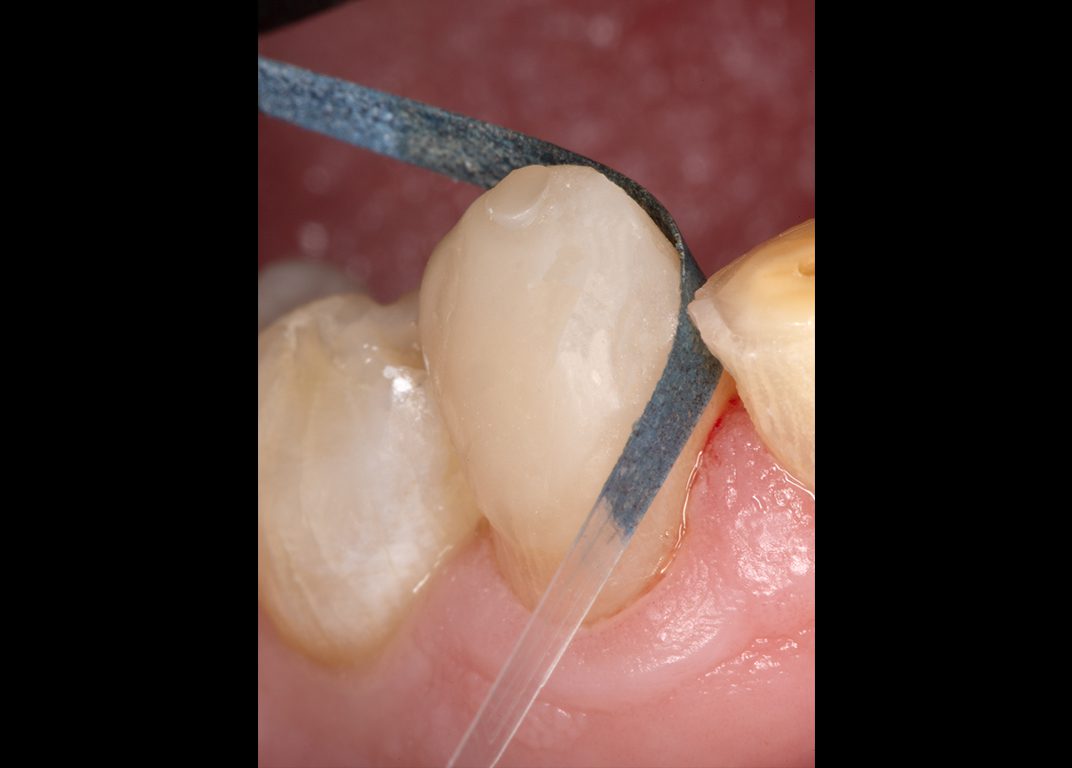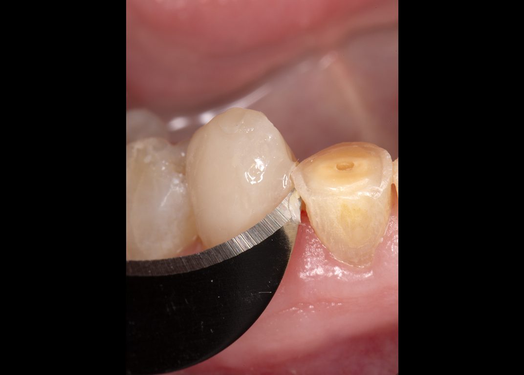 The excess polymerized composite resin was removed with a scalpel blade (#12 BD Bard-Parker).